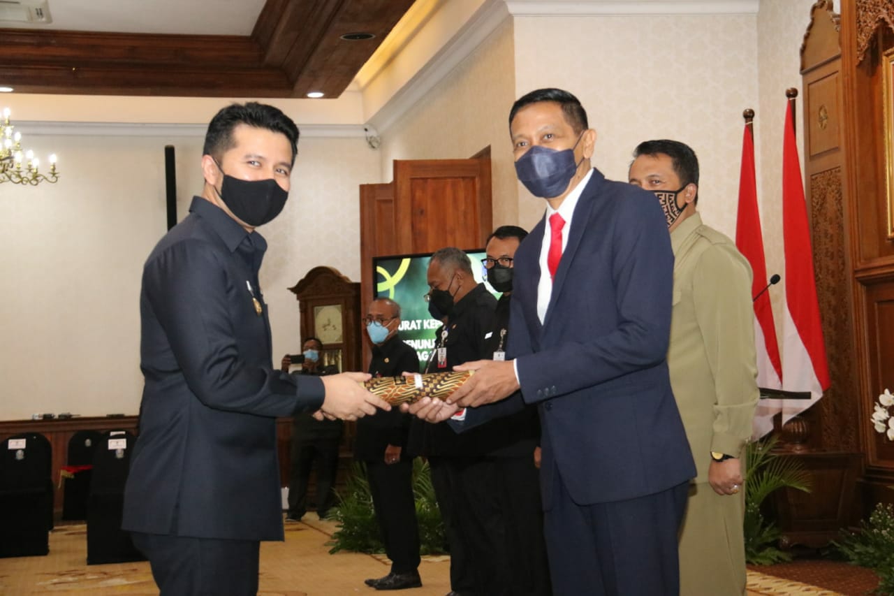 ”Berkaitan dengan ini, maka Gubernur menetapkan keputusan penunjukkan Sekda sebagai Plh tersebut yang masa jabatan Bupati Walkota yang habis masa jabatanya 17 Februari 2021, selanjutnya agar dilakukan serah terima memory jabatan dari Bupati Walikota kepada Plh Bupati Walikota. Tentunya dengan harapan bahwa para penerima SK Plh Bupati/Walikota dapat menjalankan tugas ini dengan sebaik-baiknya,” terang Emil.