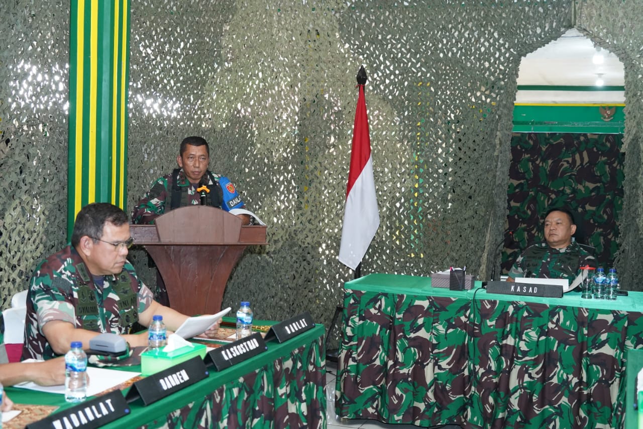 Sebelum melaksanakan pengarahan kepada seluruh peserta latihan, Kepala Staf Angkatan Darat (Kasad) Jenderal TNI Dr. Dudung Abdurachman menerima paparan dari Panglima Divisi Infanteri 2 Kostrad Mayjen TNI Haryanto, S.I.P., M.Tr. (Han). Selaku Komandan Latihan (Danlat) tentang mekanisme latihan Pratugas Satgas Pamtas Mobile TNI di Wilayah Papua Yonif MR 411/Pandawa/6/2 Kostrad TA 2023.