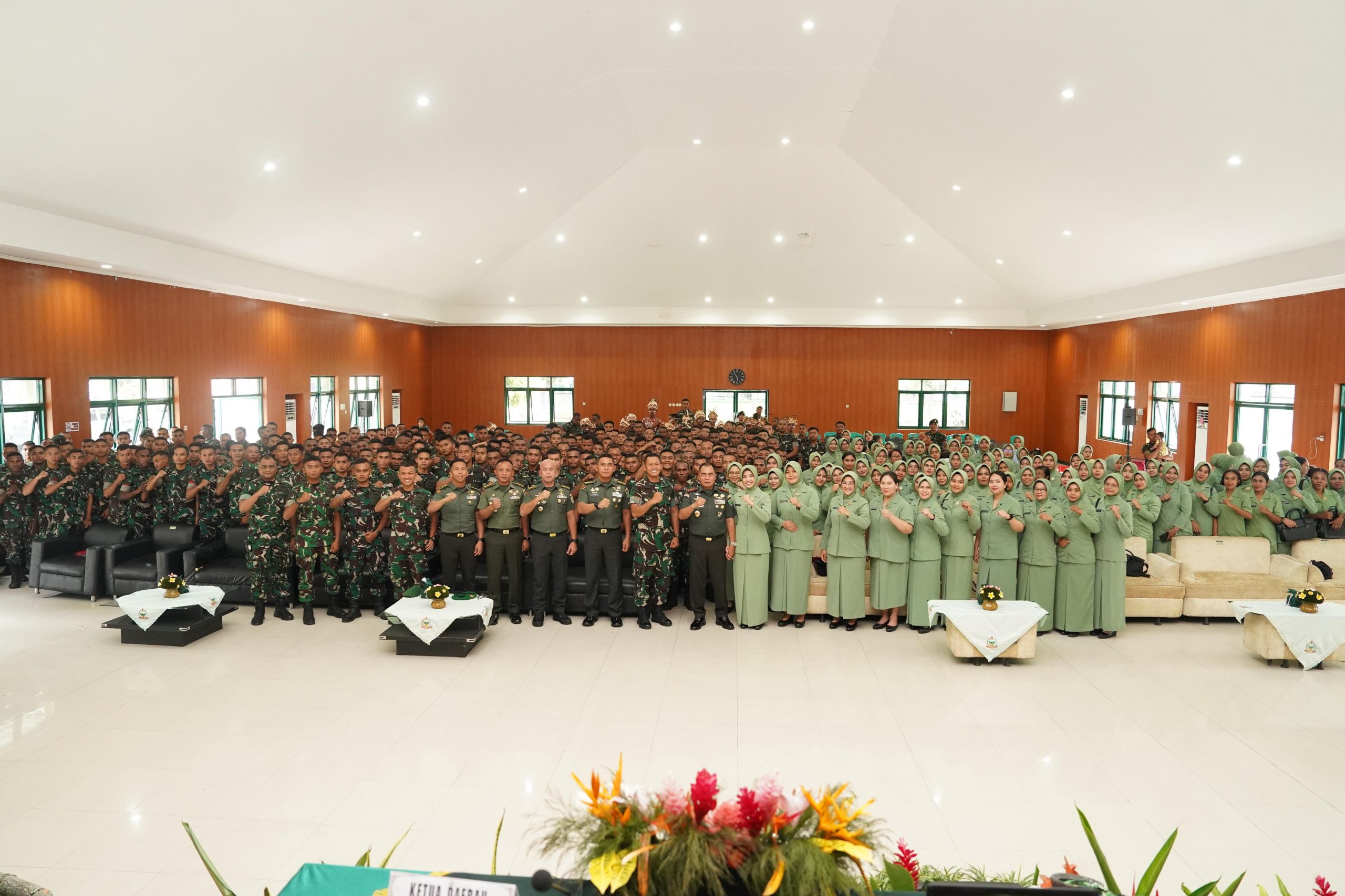 Dalam arahannya, Pangdam menyampaikan, “Saya berpesan untuk seluruh Prajurit didepan saya agar selalu menjaga kesehatan, pasalnya kita adalah prajurit yang berdinas di Papua, jadi harus selalu siap siaga kapanpun digerakan. Untuk Ibu Persit wajib mendukung tugas suaminya, baik secara moril maupun doa.” Pesan Mayjend TNI Rudi Puruwito, S.E., M.M.