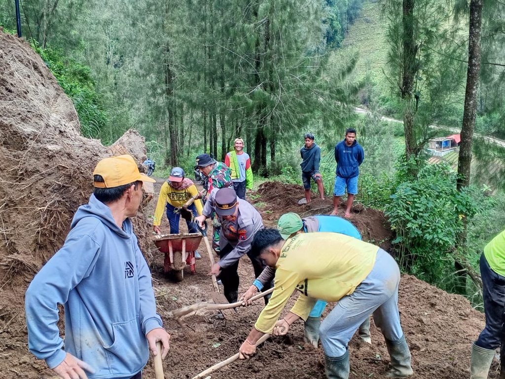 Anggota kepolisian bersama TNI, BPBD, dan warga sekitar, bahu-membahu membersihkan material longsor agar kendaraan dapat melintas kembali di jalan tersebut.