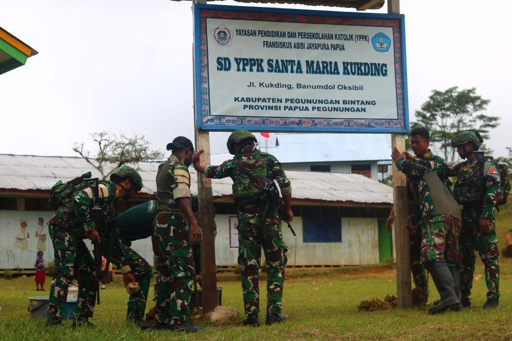Pegunungan Bintang lenbari com ||Papua Pegunungan — Dalam rangka menyambut HUT ke-80 Kemerdekaan Republik Indonesia, Pos Okpol Satgas Pamtas RI–PNG Yonif 751/VJS bersama Satgas Ter dan Satgas Banmin melaksanakan karya bakti di SD YPPK Santa Maria Kukding, Kabupaten Pegunungan Bintang, pada Minggu (10/8/2025).