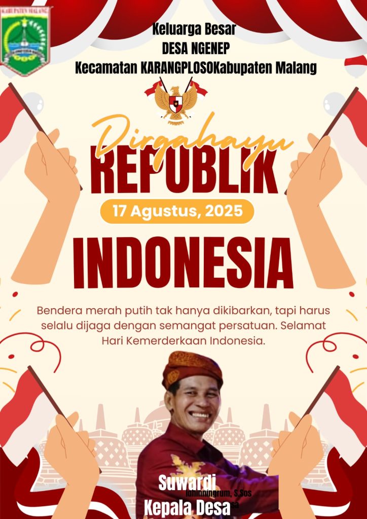 Nasional Keluarga Besar Desa Ngenep Kecamatan Karangploso Kabupaten Malang Mengucapkan Selamat HUT RI Ke- 80 admin 14 Agustus 2025 0 BACA JUGA: KEK Singosari Kabupaten Malang: Pusat Kegiatan Ekonomi dan Pembanguna BACA JUGA: Makam Pahlawan Mendapat Perhatian Khusus dari Kepala dan Lurah Kecamatan Lawang dalam Rangka HUT RI Related Posts:Pasar Semi Modern Sayur,Grosir Pasar Karangploso…Karangploso Terlayani Lebih Baik: Tirta Kanjuruhan…Penyampaian Rancangan Peraturan Daerah tentang…Polres Malang Beri Modal Usaha Untuk Keluarga Korban…Hj. Idhiningrum Ketua GM FKPPI Kabupaten Malang…Tragedi Kanjuruhan,Polres Malang Gelar Forum…Powered by Contextual Related Posts Continue Reading Previous KEK Singosari Kabupaten Malang: Pusat Kegiatan Ekonomi dan PembangunanNext Sinergi Penuh Semangat: Divif 2 Kostrad dan AWSSK Gelar Olahraga Bersama Sambut HUT RI ke-80 More Stories Nasional Warga Lawang Gelar Aksi Bersih Sungai, Dukung Program Penanganan Sampah Nasional admin 11 April 2026 0 Nasional Prabowo Gelar Bazar Rakyat di Monas, Hadirkan Kebahagiaan Lebaran untuk Warga admin 28 Maret 2026 0 Nasional Warga Perbatasan Pasuruan–Malang Gotong Royong Aspal Jalan Alternatif di Turirejo admin 16 Maret 2026 0 Tinggalkan Balasan Batalkan balasanAnda harus masuk untuk berkomentar.