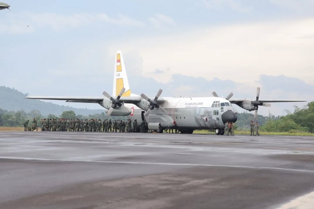 Lenbari.com Pendiv2 ||Prajurit Yonif 501 Kostrad tiba di Bandara Depati Amir, Bangka Belitung menggunakan pesawat C-130 Hercules, untuk melaksanakan Latihan Gabungan TNI. Latihan ini digelar untuk meningkatkan kesiapsiagaan TNI dalam menghadapi berbagai ancaman serta menjaga keamanan wilayah strategis di kawasan Bandara Depati Amir, Selasa (18/11/2025).